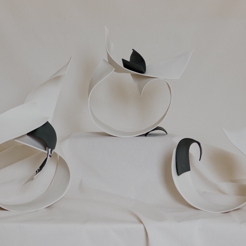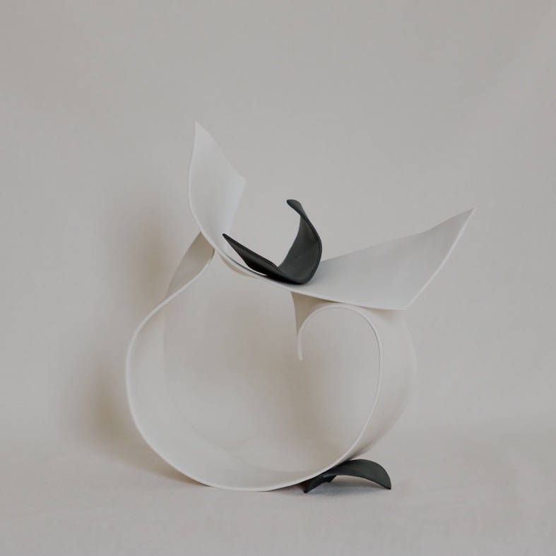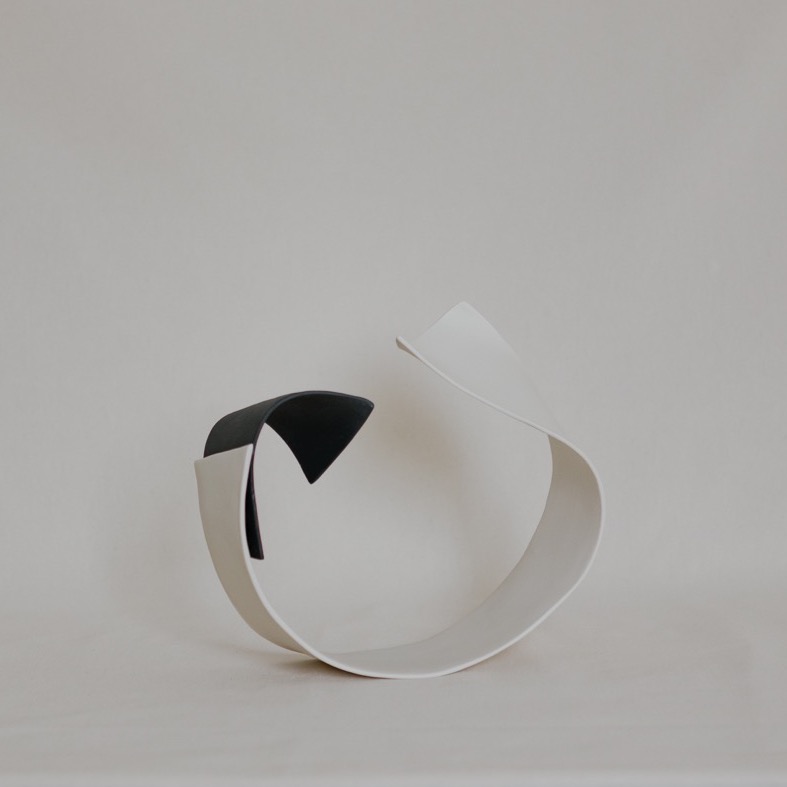 Divenire è una ricerca che richiama il costante fluire della nostra esistenza, un intreccio di fluide forme di porcellana, che scorrono e si susseguono in un alternarsi di bianco e nero.