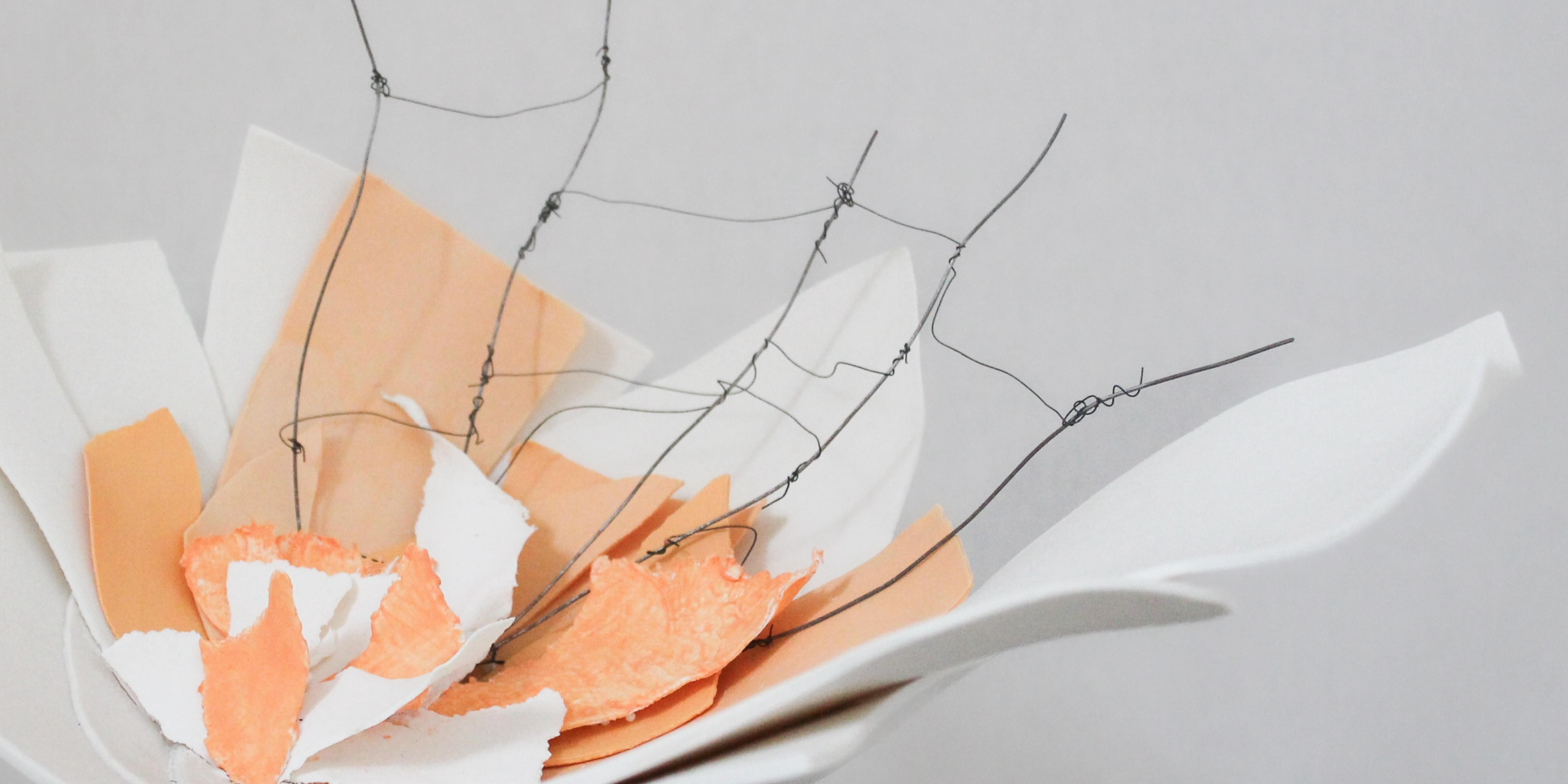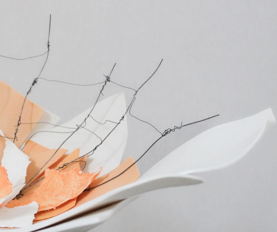 La serie Tra(n)sformazione gioca sul concetto legato all’etimologia della parola trasformazione, dal latino derivato di transformare , trans= al di là e formare = dare forma. Al di là della forma. Sottili foglie di porcellana si inseguono e si intrecciano a fili di metallo, mutano il colore e la materia a testimonianza della loro metamorfosi. Due materiali apparentemente tanto distanti nelle proprietà, così come nell’estetica, convivono all’interno della stessa materia. Come avviene anche nell’animo umano, la presenza di una dualità, di un’opposizione che spesso raggiunge la pienezza nel suo equilibrio.